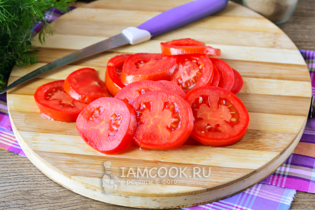 Вымытые помидоры нарежьте средними по толщине кружочками.