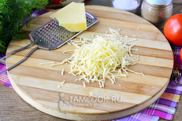 Твердый сыр натрите на терке. Терку используйте на ваш выбор - с более крупными или мелкими ячейками.