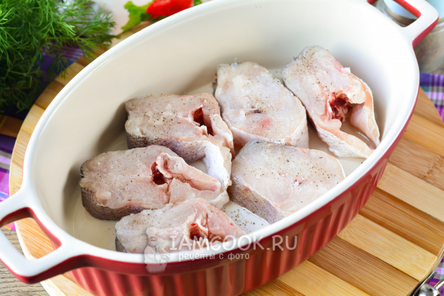 Форму для запекания смажьте маслом, распределите по дну равномерно кусочки хека. Посолите и поперчите рыбу.