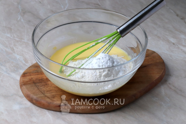 Затем частями введите просеянную пшеничную муку с разрыхлителем.