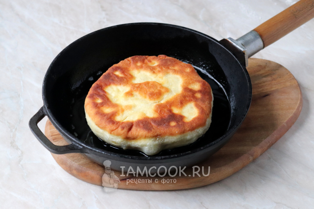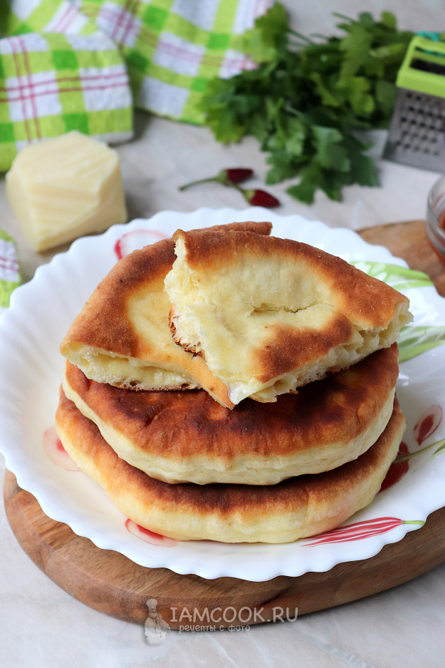 Очень вкусные лепешки с сулугуни, замешанные на кефире, готовы. Подавайте их на стол в горячем виде, пока сыр ещё тянется.