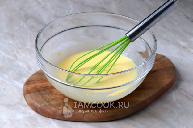 Первым делом замесите тесто. В глубокой миске соедините кефир комнатной температуры, соль и куриное яйцо. С помощью венчика тщательно перемешайте до однородного состояния. Кефир можете использовать любой жирности, у меня 1%.