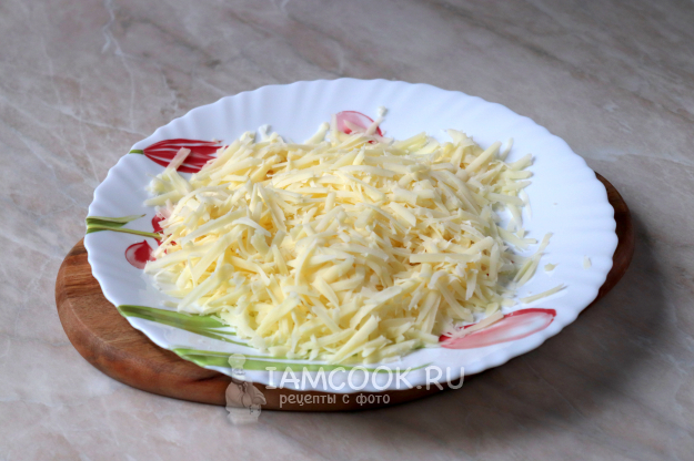 С начинкой всё просто. Натрите сыр сулугуни на тёрке с крупными ячейками.