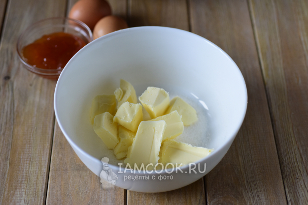 За это время успеем приготовить сдобу. В миску выложить мягкое масло и засыпать оставшийся сахар.