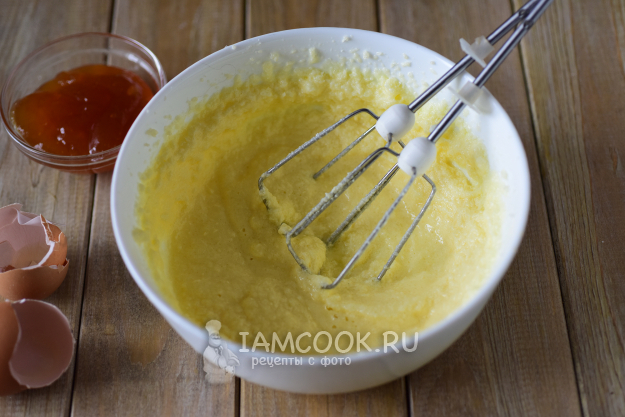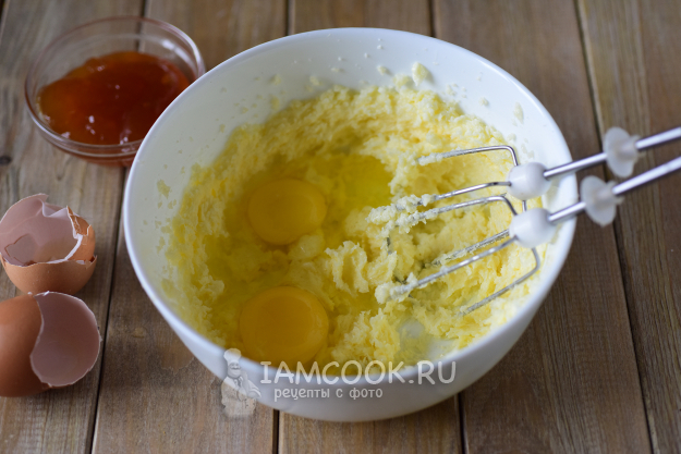 Взбить миксером до получения кремообразного состояния. Вбить яйца.
