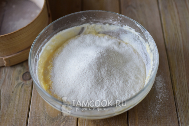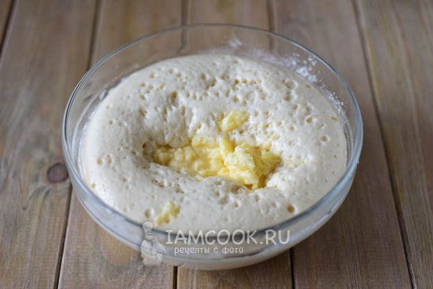 В миску к опаре добавить сдобную смесь. Перемешать.