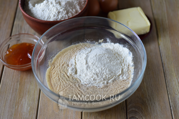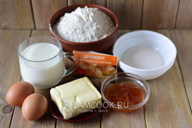 Подготовить продукты для булочек-цветочков из дрожжевого теста с джемом в середине. Масло сливочное выложить на стол примерно за час до начала работы, чтобы оно стало мягким. Молоко должно быть теплым, поэтому можно немного подогреть на плите, примерно до температуры в 37 градусов.