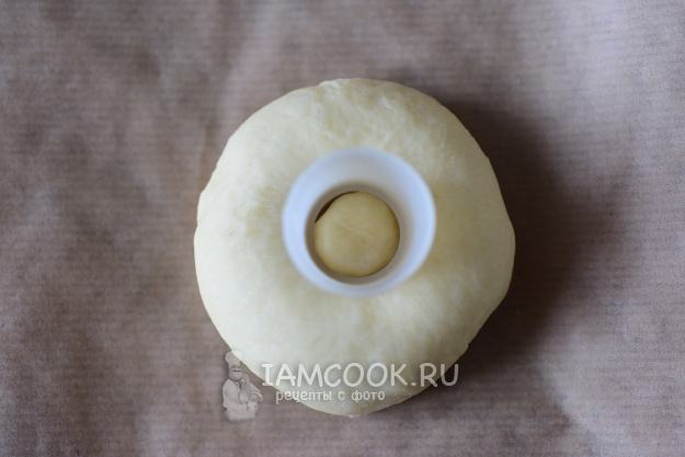 От общей массы теста отщипнуть кусочек весом в 100 г. Скатать из него шарик, положить на рабочую поверхность, в середину вставить любую круглую трубочку (у меня - кондитерский переходник диаметром 2,5 см), надавить, но не до конца.