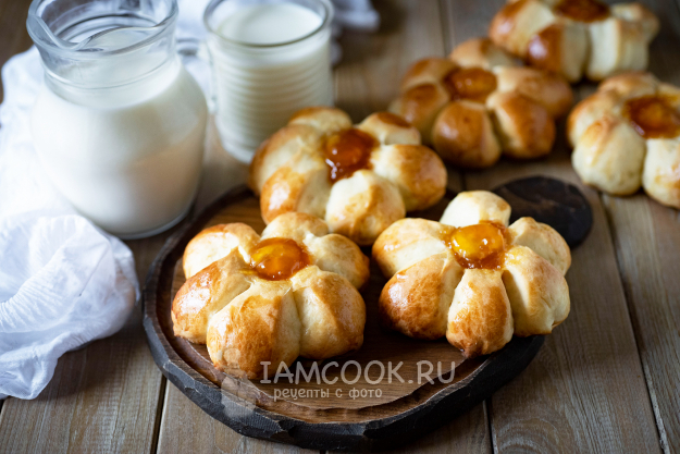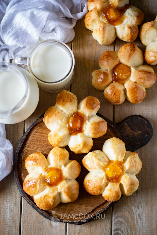 Дрожжевые булочки-цветочки с джемом получаются очень красивыми, мягкими и вкусными. Приятного аппетита!