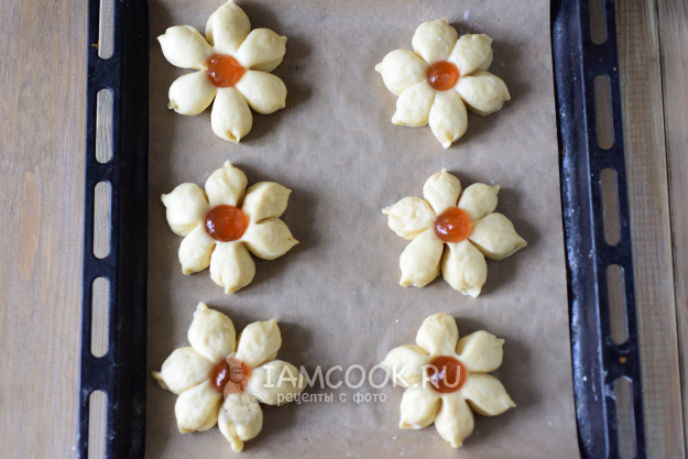 Вытащить трубочку из заготовки булочки и переложить на противень, застеленный пищевым пергаментом. Таким образом сформировать заготовки булочек-цветочков из всего теста. Серединку каждой заготовки булочки заполнить джемом, а лепестки смазать смесью желтка и чайной ложки воды.