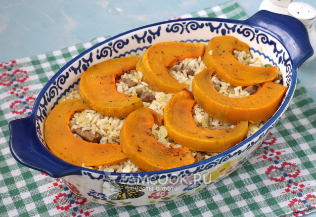 Затем выложить начинку и сверху разложить оставшуюся тыкву. Если готовить слоями, то на тыкву выложить половину риса, затем половину мяса и лука. Повторить ещё раз слои и сверху также разложить тыкву. В форму налить стакан горячей воды и накрыть фольгой.