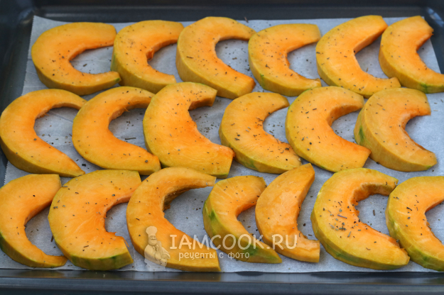 Застелить пергаментом противень и выложить на него ломтики тыквы, немного смазать их растительным маслом и по желанию посыпать сухими травами (у меня - базилик). Запекать 15 минут при 180 градусах. За это время тыква полностью не приготовится, так и нужно. Потом она будет готовиться с остальными ингредиентами вместе.