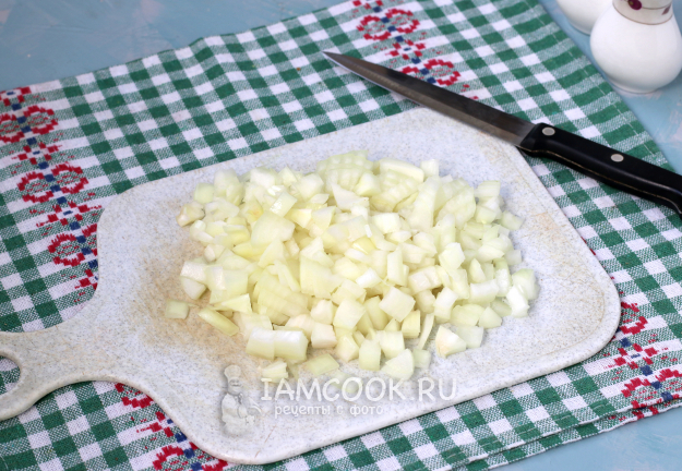 Лук почистить и нарезать кубиками, обжарить на отдельной сковороде также на топлёном масле.