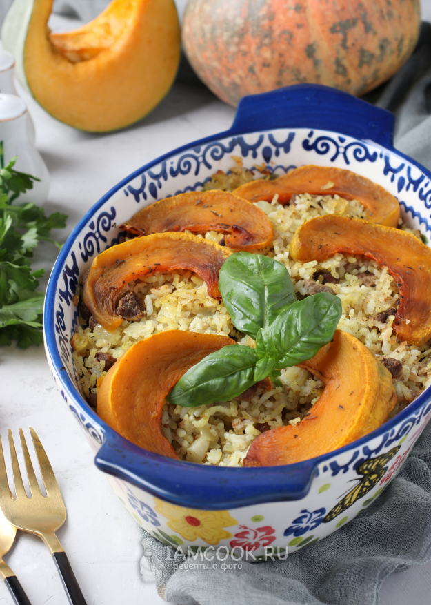 Горячую мусаку с тыквой подать к столу в форме, затем разложить по порциям.
