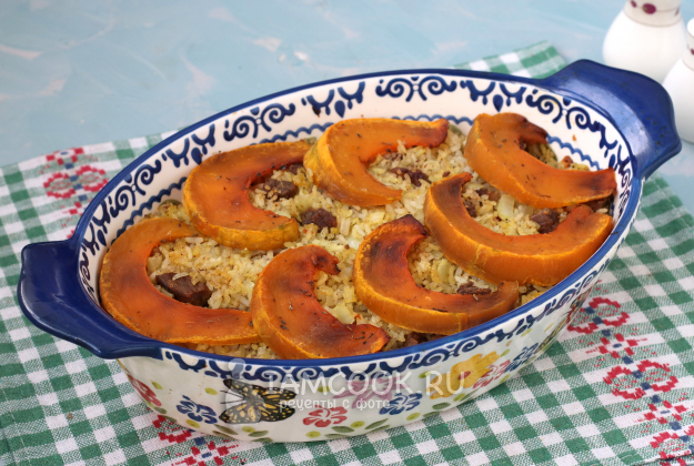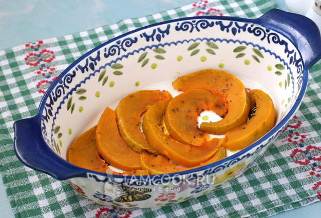 Форму для запекания смазать маслом, выложить половину тыквы.