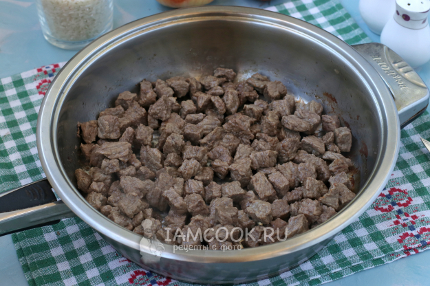 В сковороде растопить топлёное масло (я заменила на растительное) и обжарить мясо до румяной корочки. Затем налить 100 мл горячей воды, накрыть сковороду крышкой и готовить 40 минут на небольшом огне.