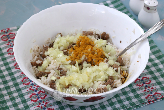 Рис переложить в миску, добавить мясо и лук. Можно это всё не соединять, а выкладывать в форму слоями, тогда количество лука нужно вдвое увеличить, чтоб его хватило покрыть 2 слоя. Добавить карри, соль и перец. Перемешать все ингредиенты.