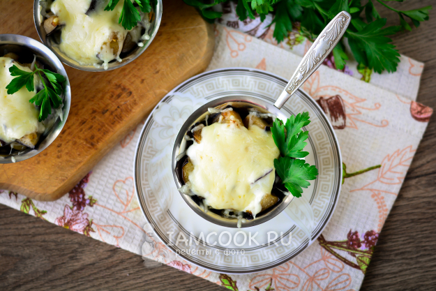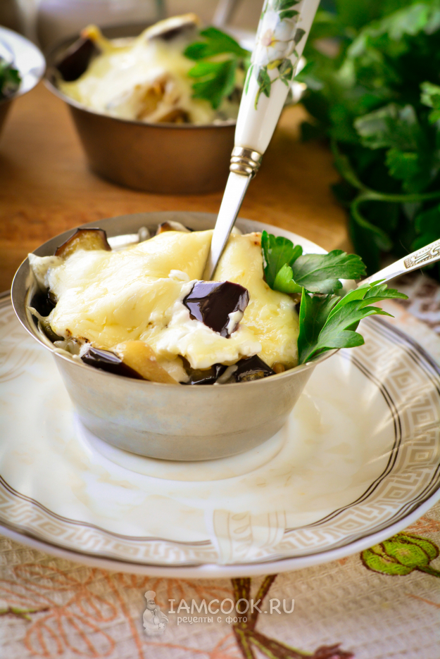Запекайте жульен из баклажанов при 200°С примерно 20 минут. За это время овощи как раз станут полностью готовыми, а сметана и сыр станут вкуснейшим соусом.