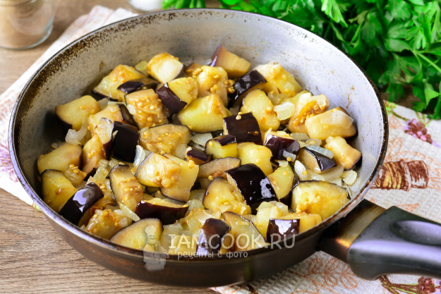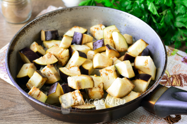 Перемешайте и обжаривайте баклажаны с луком 3-4 минуты на среднем огне. Если что - добавьте еще немного масла. Баклажаны должны стать мягкими, почти готовыми.
