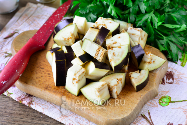 Очищенный репчатый лук нарежьте мелкими кубиками. Лук отлично сочетается с баклажанами и придает им дополнительный пикантный вкус.