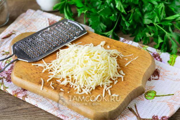 Твердый сыр натрите на средней или любой другой терке. Сыр берите любой - пикантный или с более классическим вкусом и ароматом.