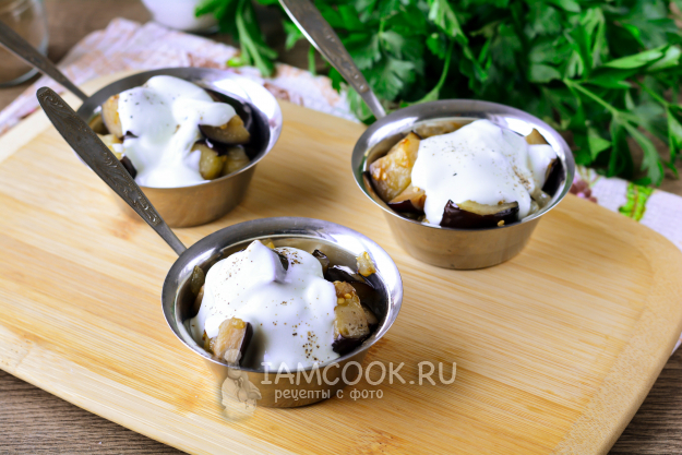Полейте баклажаны сметаной. Жирность соуса выбирайте на свой вкус. Я взяла 15% сметану - она не сильно густая. Также при желании чуть поперчите жульен.