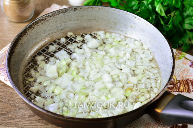 Налейте масло в сковороду, разогрейте на среднем огне, всыпьте лук и пассеруйте его пару минут до мягкости, периодически помешивая.