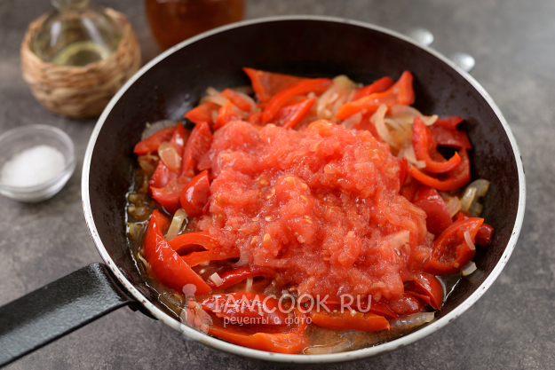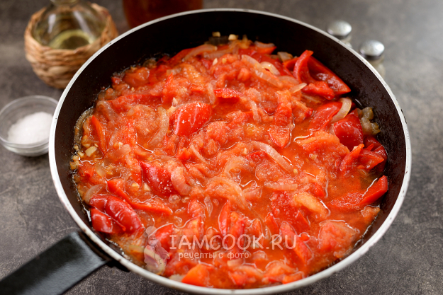 Переложите помидорную мякоть в сковороду, тушите на умеренном огне минут 15, жидкость должна немного выкипеть.