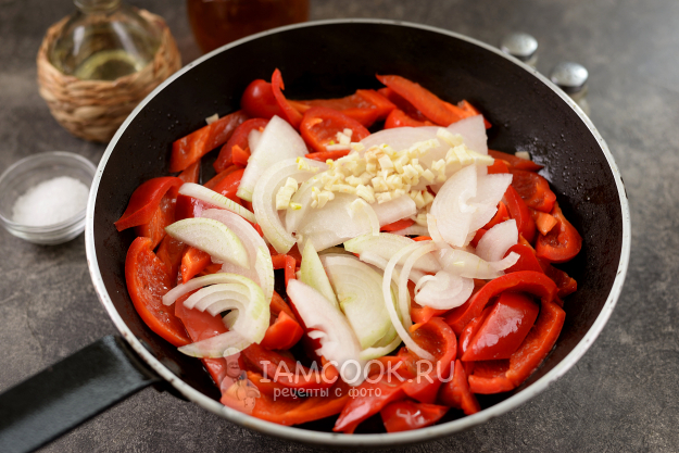 Репчатый лук нарежьте полукольцами, измельчите чеснок, добавьте в сковороду к перцу. Готовьте на тихом огне минут 5.
