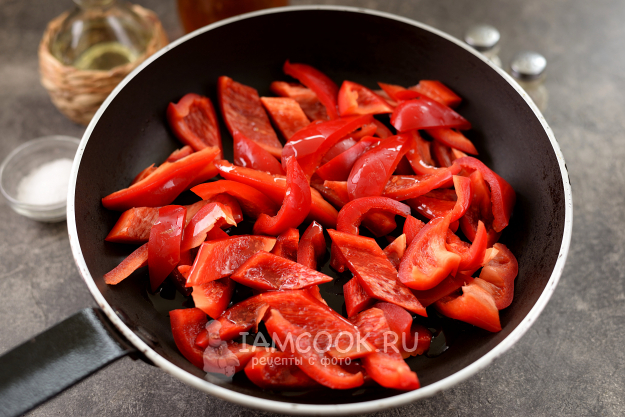 Перец очистите от семян и плодоножки, нарежьте мякоть небольшими кусочками. Разогрейте в сковороде рафинированное растительное масло, выложите в него перец, обжарьте пару минут.