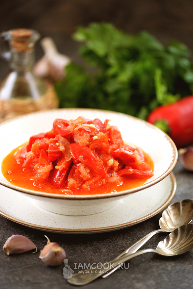 Подготовьте продукты для болгарской манджи. Лук и чеснок почистите, помойте вместе с перцем и помидорами.