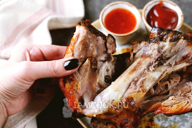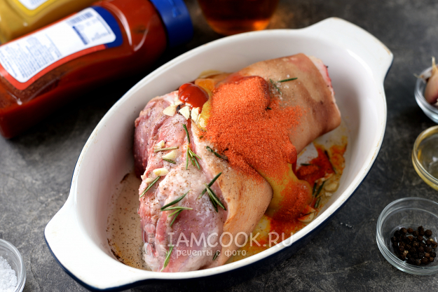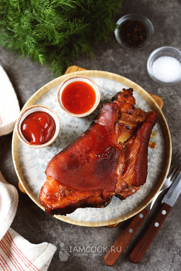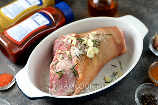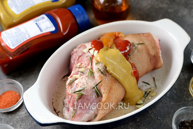 Тщательно натрите рульку всеми соусами и специями, оставьте мариноваться минимум на час. Спустя время влейте в противень немного воды, накройте его фольгой и отправьте в предварительно разогретую до 190 градусов духовку на 1,5 часа. Дальше снимите фольгу и запекайте свиную рульку в медово-горчичном соусе в духовке еще час минимум без конвекции.