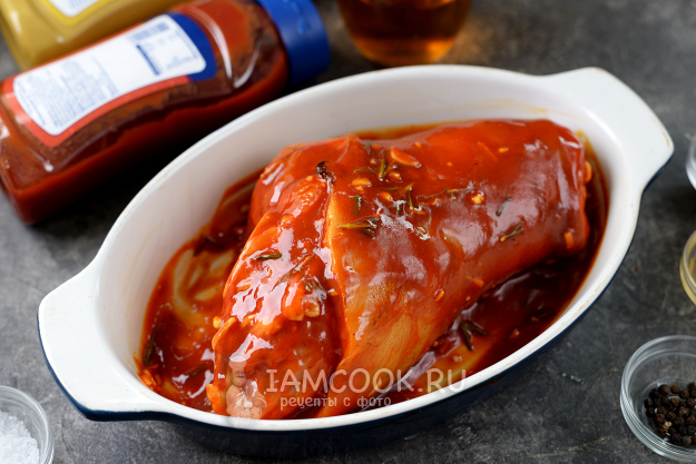 Дальше положите не слишком острую горчицу, томатный соус любимого производителя и мед.
