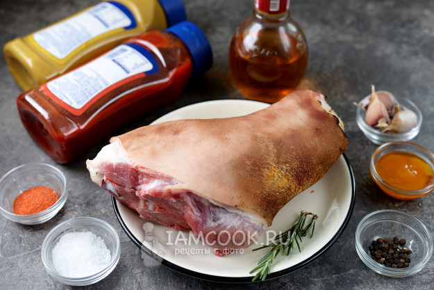 Подготовьте необходимые продукты для запекания свиной рульки в медово-горчичном соусе в духовке. Рульку помойте, обсушите, при необходимости осмолите над газовой конфоркой и зачистите остатки ворса острым ножом.