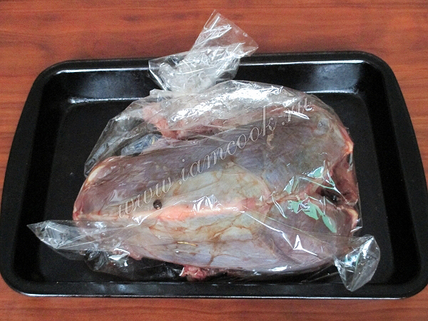 Поместите окорочка и грудку в пакет для запекания и забросьте в него ягоды можжевельника.