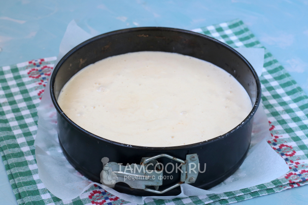Сверху вылить тесто, пару раз крутануть форму в руках, чтобы тесто прилипло к ободку и в центре не образовался купол.