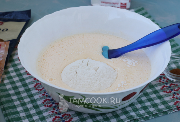 Добавить в тесто муку и разрыхлитель и аккуратно вмешать их лопаткой складывающими движениями.