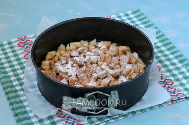 Дно формы застелить пергаментом, высыпать яблоки, разровнять и посыпать их корицей и крахмалом.