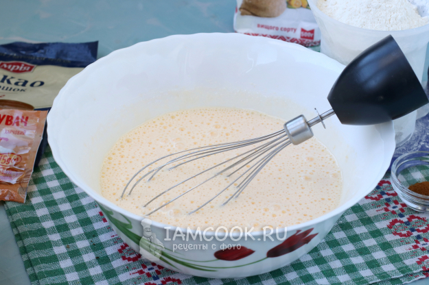 В миску разбить яйца и взбивать венчиком или миксером, понемногу добавляя сахар. Взбивать около 10 минут - до пышной и посветлевшей массы.