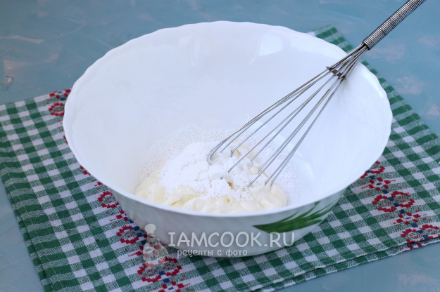 Приготовить сметанный крем. Сметану вылить в миску, добавить сахарную пудру и тщательно перемешать.