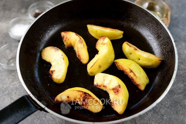 В это же масло выложите ломтики очищенной от сердцевины айвы и так же быстро обжарьте. Это придаст готовому блюду уникальный вкус и аромат.