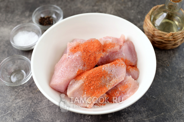 Нарежьте филе индейки крупными кусочками, положите в глубокую миску, посыпьте солью и перцем, а также любимой приправой для мяса. Хорошенько перемешайте, оставьте на пару минут мариноваться.