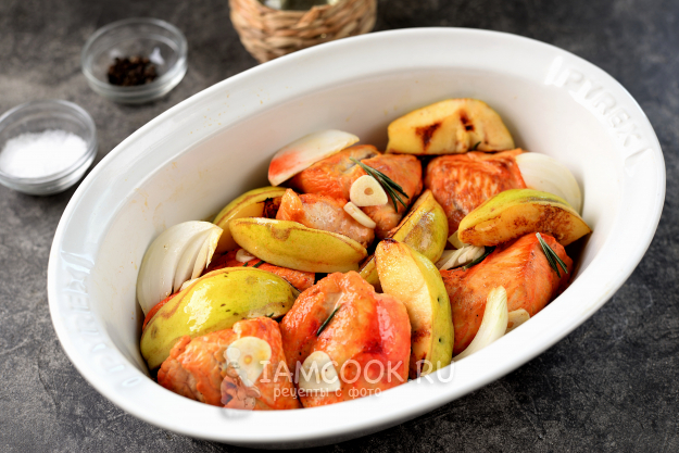 Между кусками индейки положите ломтики айвы, влейте немного воды из чайника. Накройте форму фольгой и отправьте ее в предварительно разогретую до 180 градусов духовку на 30-40 минут без конвекции.