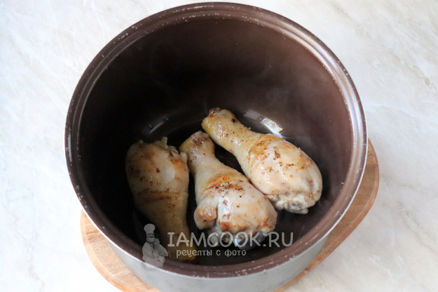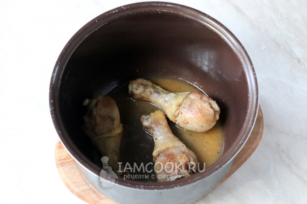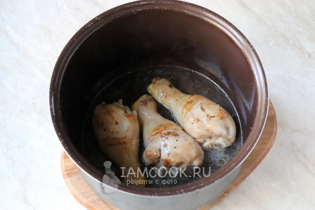 Когда масло хорошо прогреется, выложите голени и обжарьте их с обеих сторон до золотистой корочки. Время жарки будет зависеть от мощности вашей мультиварки и от того, насколько сильно она нагревает чашу, поэтому ориентируйтесь по цвету.