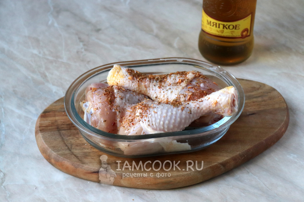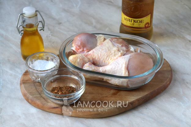 Возьмите необходимые продукты для приготовления курицы в пиве в мультиварке. Я в данном случае использовала куриные голени, вы же можете взять любые другие её части. То же самое касается и специй, можете добавлять те, которые больше всего вам нравятся по вкусу или аромату.
