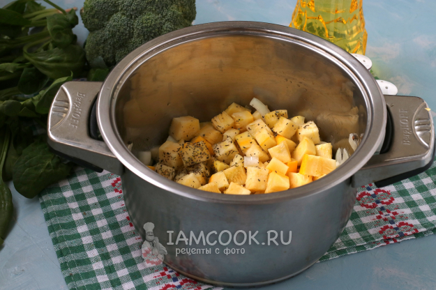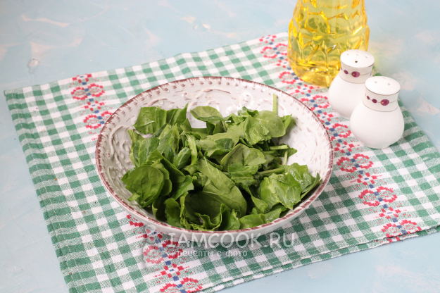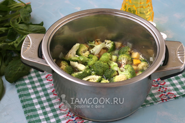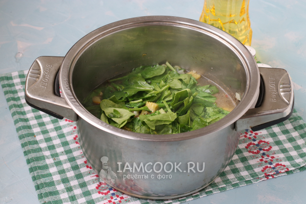 Добавить шпинат в кастрюлю и варить 5 минут.