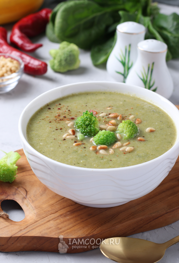 Разлить суп-пюре из брокколи и кабачков по порциям, можно посыпать поджаренными кедровыми орешками или подать с сухариками.