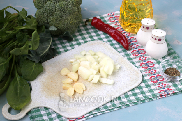 Очистить лук и чеснок. Лук нарезать кубиками, чеснок - пластинками.
