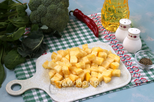 Кабачок хорошо вымыть и нарезать кубиками. Если у кабачка в середине зрелые семечки, то их нужно вырезать. Грубую шкурку тоже следует очистить.