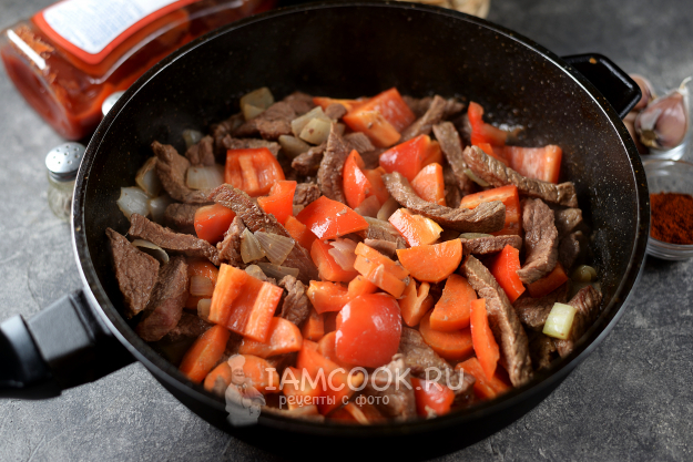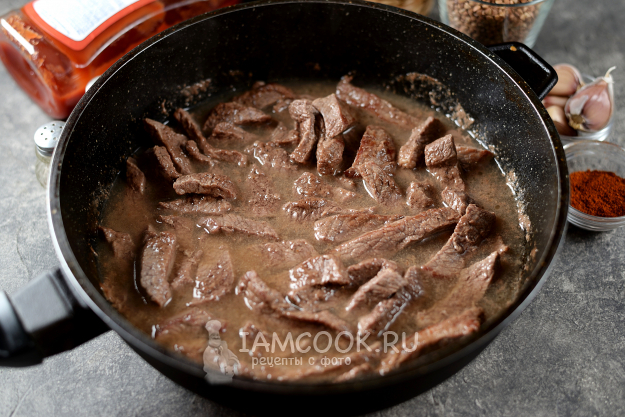 Нарежьте говядину брусочком, выложите ее на раскаленную сковороду в небольшое количество растительного масла. Как только из мяса выделится сок, накройте сковороду крышкой и тушите на умеренном огне минут 10, пока мясной сок не испарится.